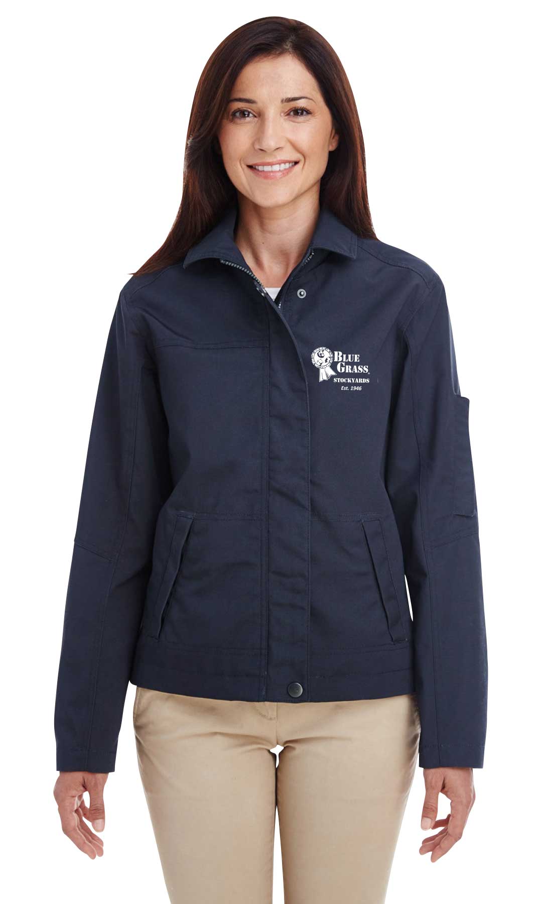 The outer shell of this jacket is water-resistant and the inside lining is 65% polyester/35% cotton. Some features are a fold down collar, inside pocket with hook and loop closure, adjustable cuffs with snaps. Back princess seams for a flattering feminine fit. Cost may vary on sizes larger than x-large.