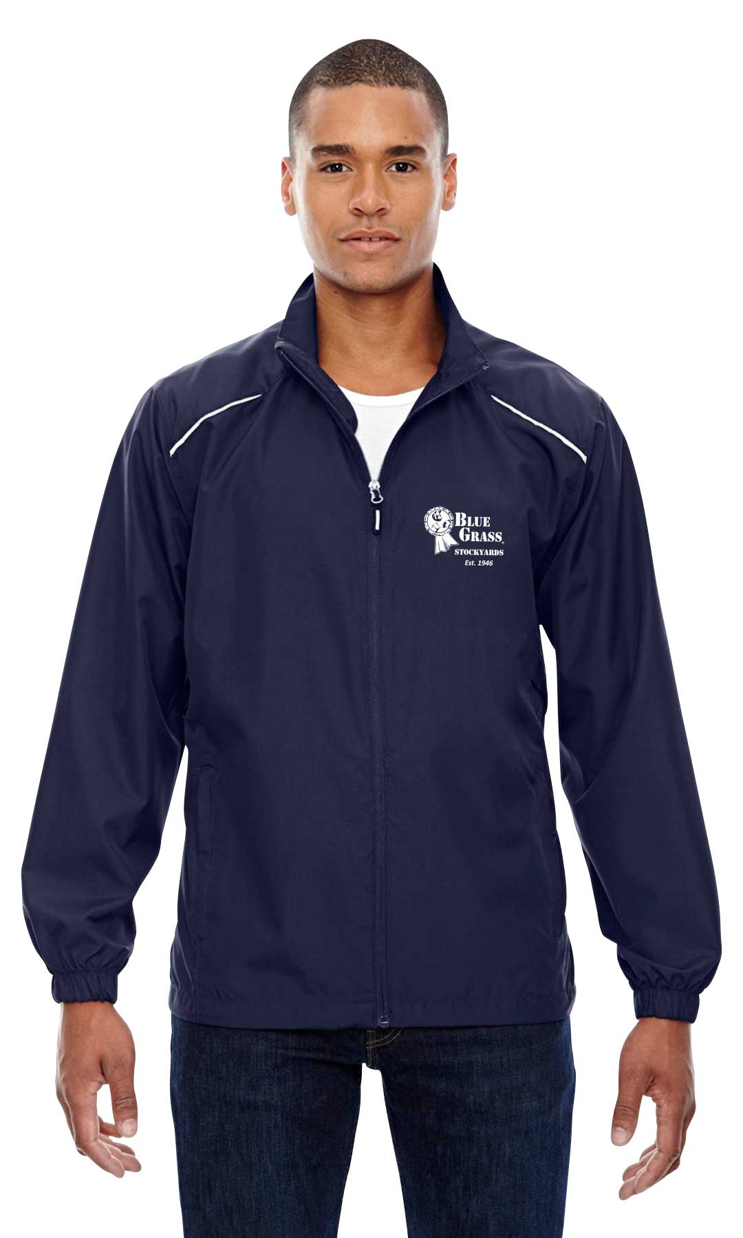 100% polyester with water resistant finish. Some features include underarm vents, lower front concealed zippered pockets with reflective toggles, audio port access through inside lower left pocket, and elastic cuffs. This jacket does not have an inside lining. Cost may vary on sizes larger than x-large.